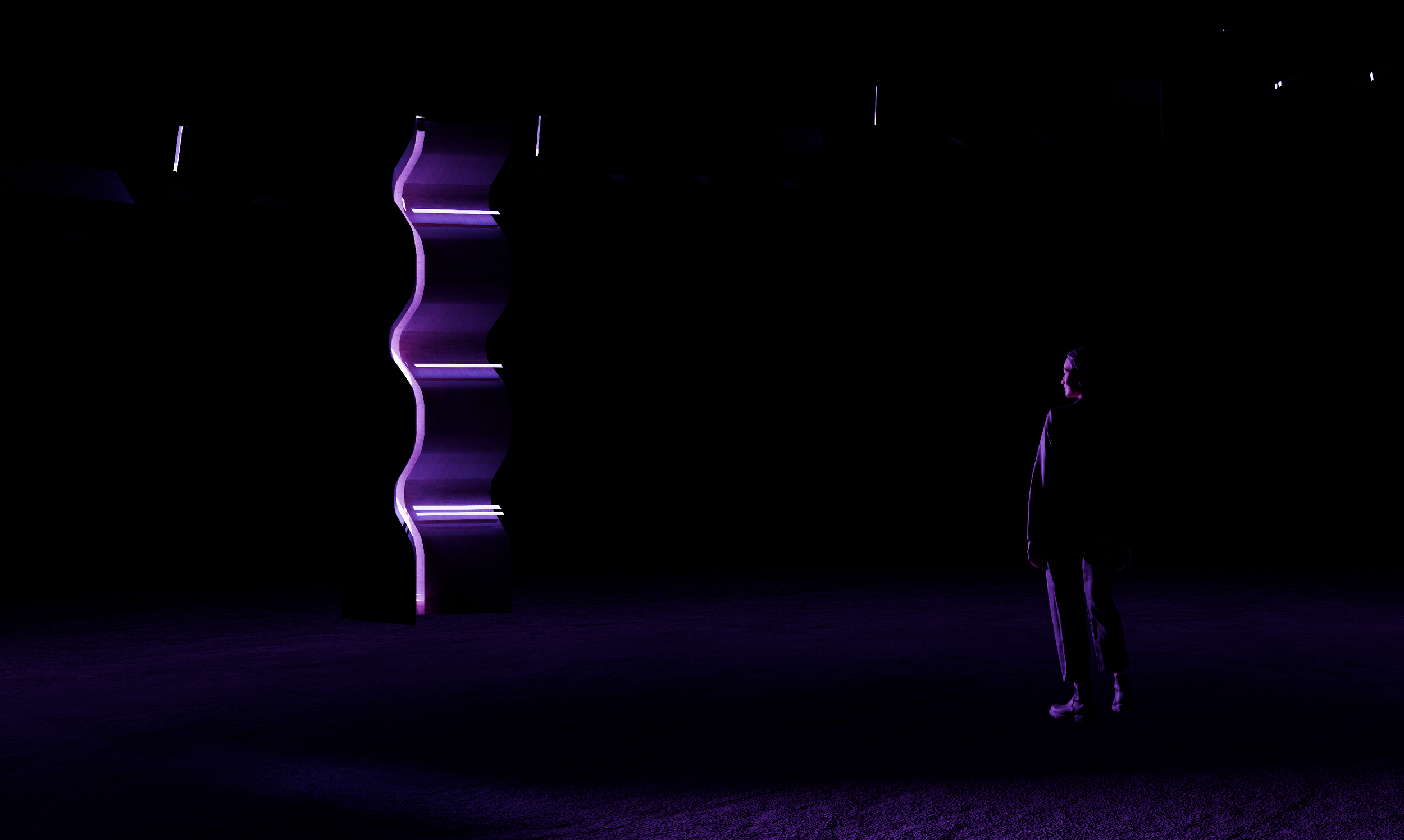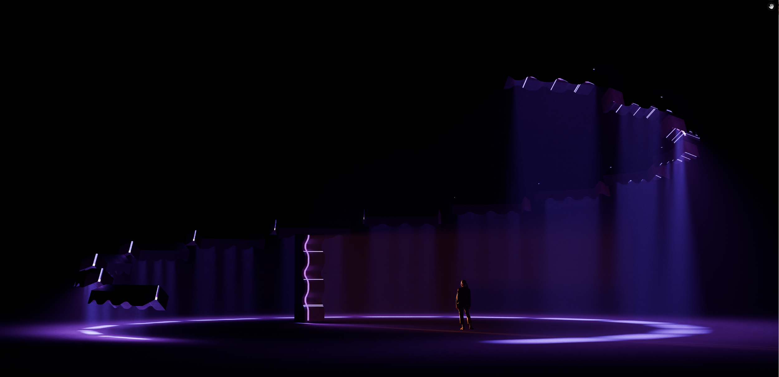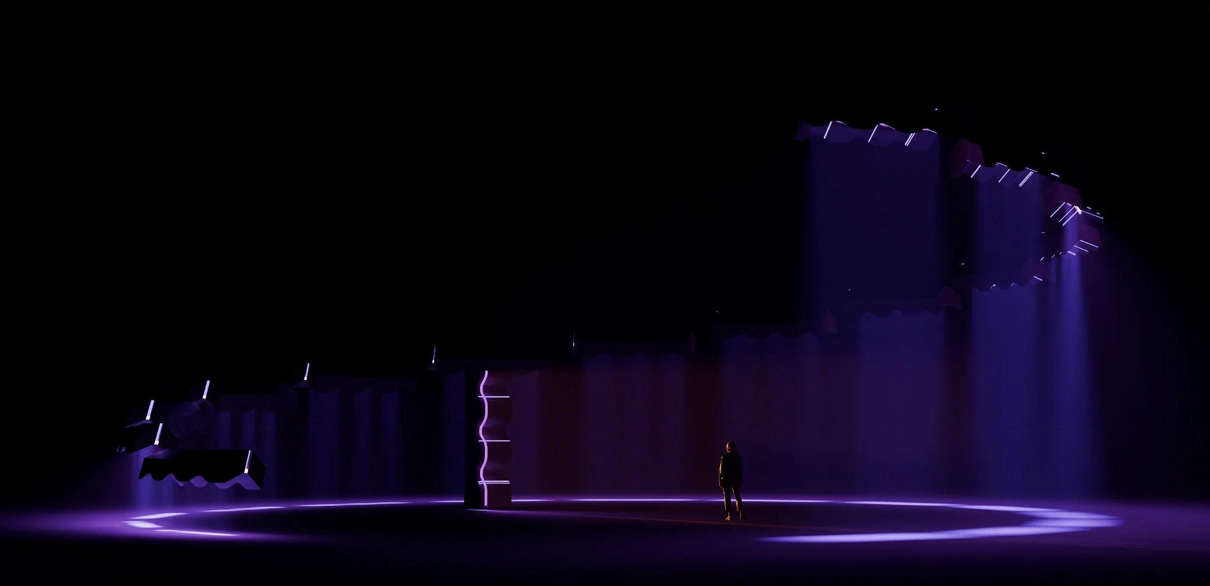 Floating structures pulse in sync with audio inputs. Beams of light descend like coded transmissions from above. And in the center, the artist stands grounded—anchored between rhythm and silence. It’s minimal, architectural, and emotional.